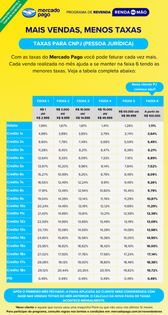 Suas taxas mudam mensalmente. No primeiro dia do mês, é feito o cálculo de qual foi o seu faturamento do mês anterior e qual será a taxa.